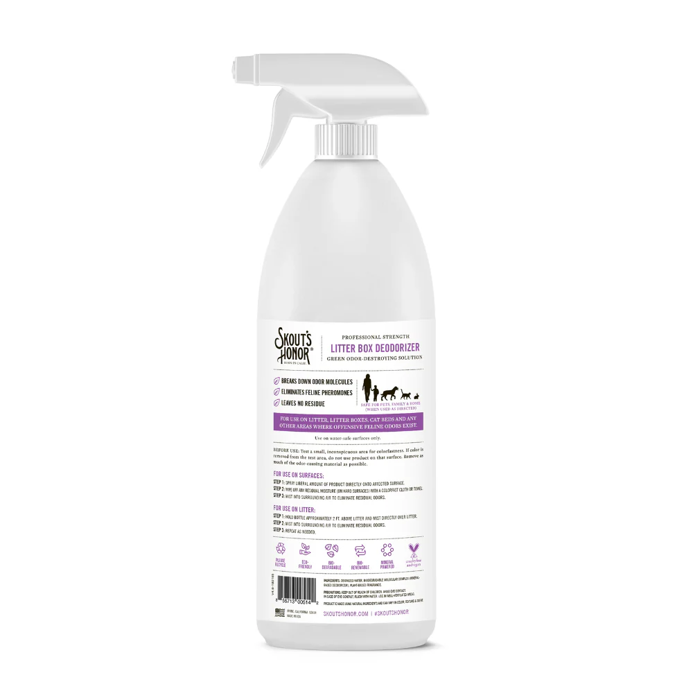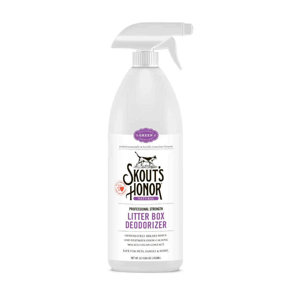 El desodorizante para areneros Skout’ s Honor es un producto que elimina instantáneamente los olores desagradables de la caja de arena con solo unas pocas aplicaciones. También se puede usar sobre o alrededor de cualquier superficie con olor, tal como camas para mascotas, botes de basura, autos, baños malolientes y más.