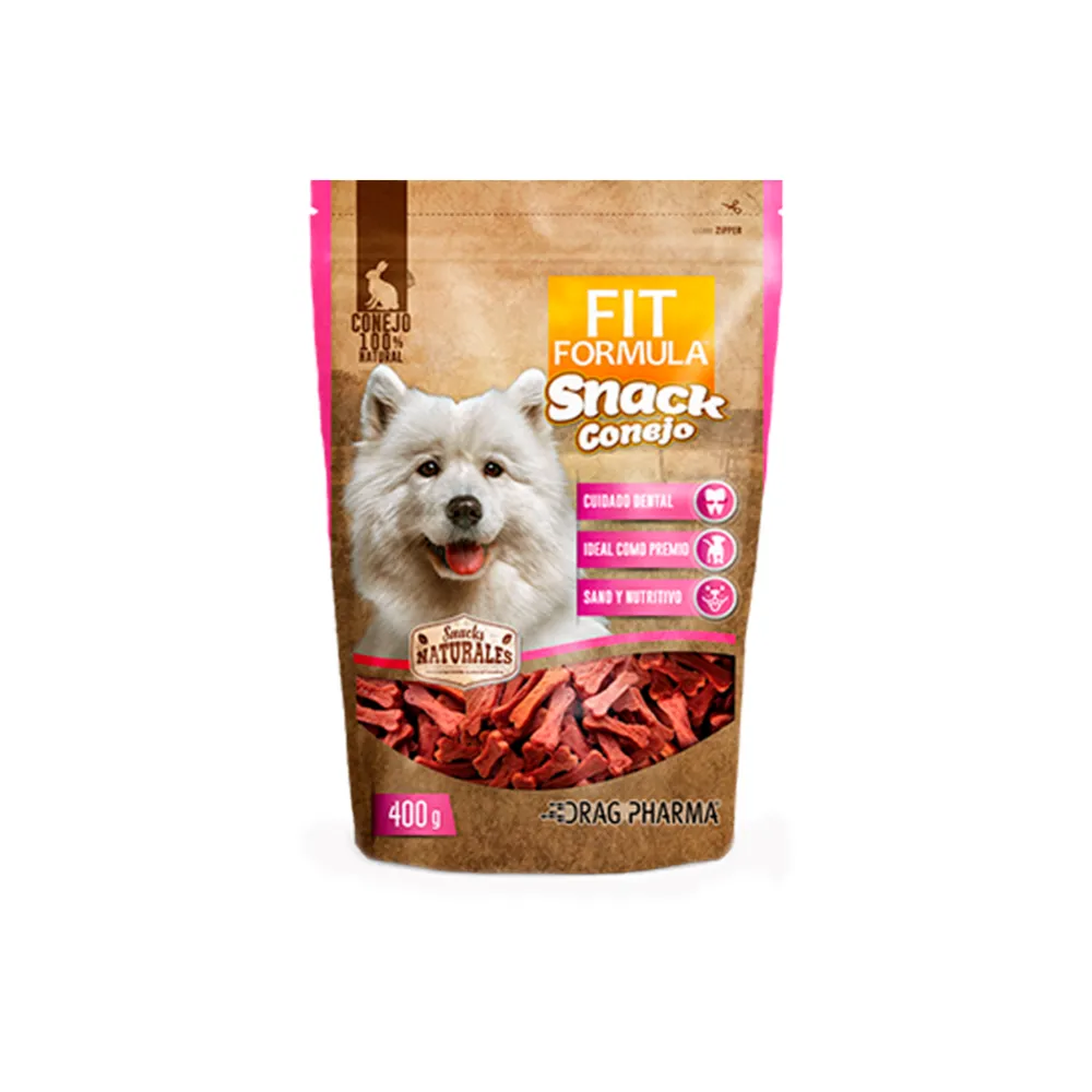 Fit Snack Conejo 400ges un snack que está diseñado especialmente para perros mayores de tres meses, y se ofrece como un premio que no solo satisface su paladar, sino que también contribuye al cuidado dental.El Snack de Conejo es una delicia sana y natural, destacándose el conejo como principal fuente de proteína. Dale a tu perro un bocadillo que amará mientras cuidas su salud.