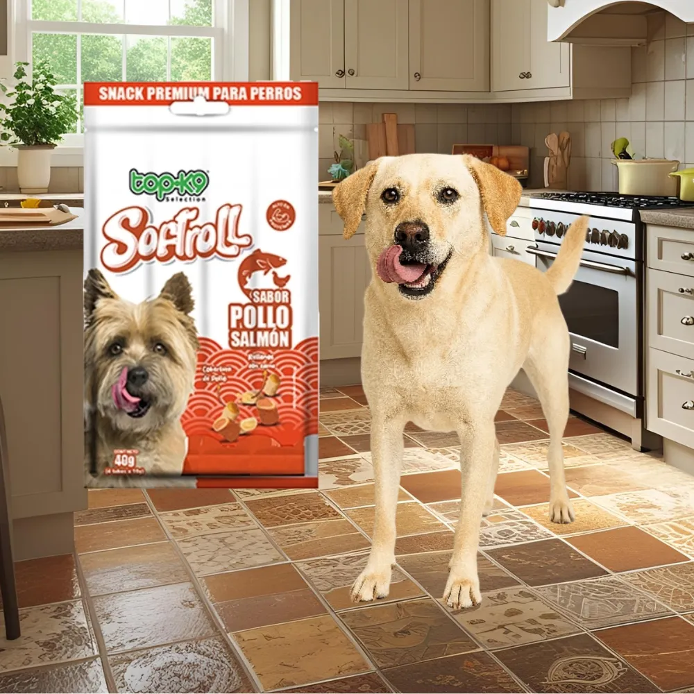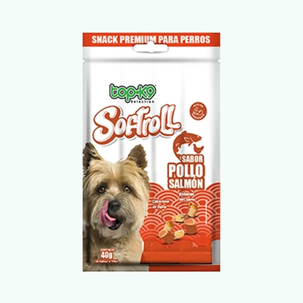 Snack Top K9 Softroll Salmón 40Gres un bocadito funcional y sabroso para perros, elaborado con salmón real y cubierto en auténtico pollo. Su textura blanda y relleno jugoso lo convierten en el snack ideal para premiar, entrenar o consentir a tu mascota en cualquier momento del día.