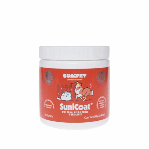 SuniCoat Piel y Pelaje es un suplemento formulado con Omegas 3-6-9 (EPA y DHA, Vitamina E y Aceite de Salmón) que fortalecen el sistema inmune de perros y gatos. Su fórmula con OMEGAS y Vitamina E, potencian una piel sana y un pelaje suave y brillante. Los Ácidos grasos omega 3, 6 y 9, reducen la inflamación y mejoran la salud de la piel. También apoyan la circulación, controlan la histamina y reducen la producción de prostaglandinas antiinflamatorias (PG2) Y Vitamina E, que ayuda a modular lo síntesis de radicales libres. Excelente antioxidante que mejora de la circulación y la regeneración de la piel. Además, fortalece el sistema inmune y la función cardiovascular. Bote de 140 gr. (70 gomitas aprox.)