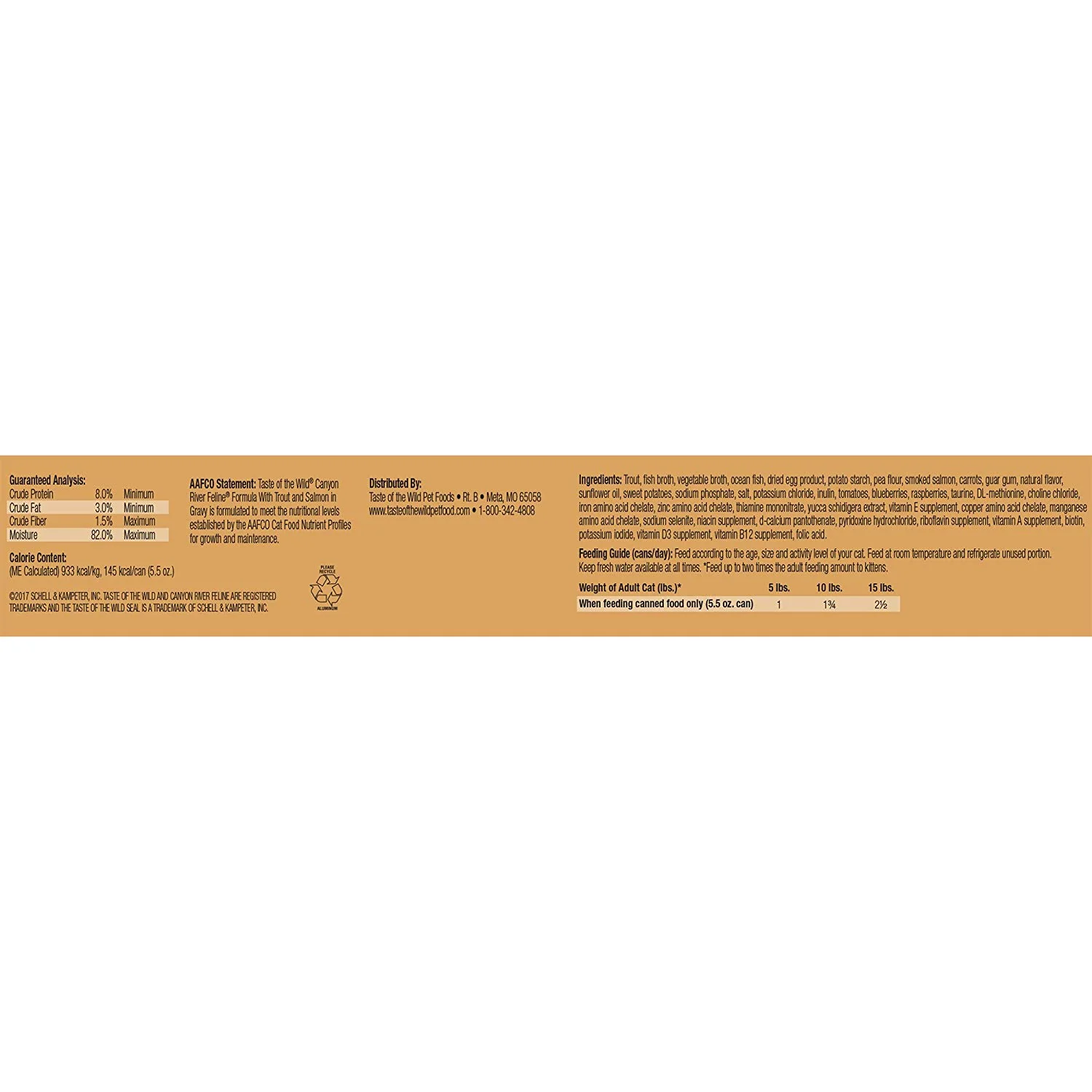 Libre de granos con camote, proporcionando alta digestibilidad y energía a su gato activo. Hecho con trucha y salmón ahumado, esta fórmula ofrece un gran sabor y proteína de pescado de la más alta calidad para la salud de su gato, adicionada con frutas y verduras, proporcionándole antioxidantes naturales para su sistema inmune y buena salud general. Su gato deseará Taste of the Wild