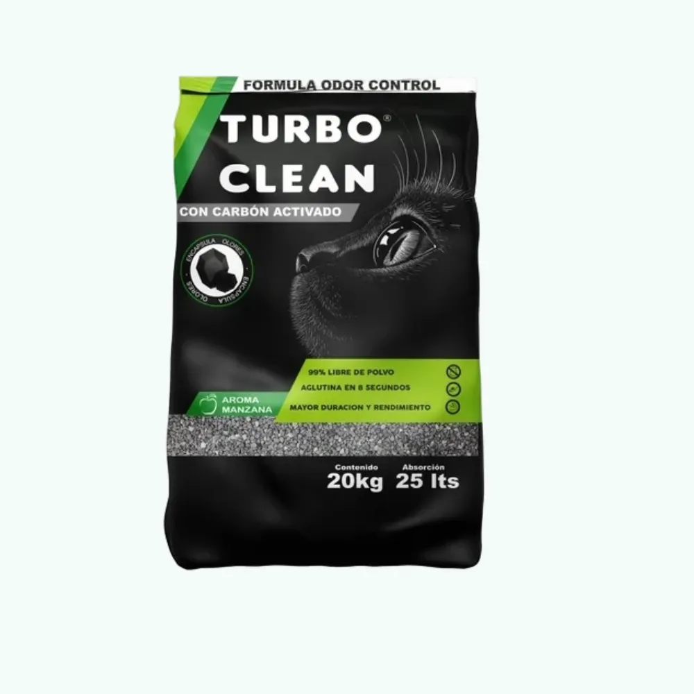 LaTurbo Clean Aglutinante Odor Control 20 Kg Manzanaofrece una limpieza poderosa con un toque fresco. Su aroma manzana natural, sumado a la bentonita 100 % natural y carbón activado, crea grumos firmes en tan solo 8 segundos, neutralizando olores mientras transforma tu hogar en un espacio acogedor.