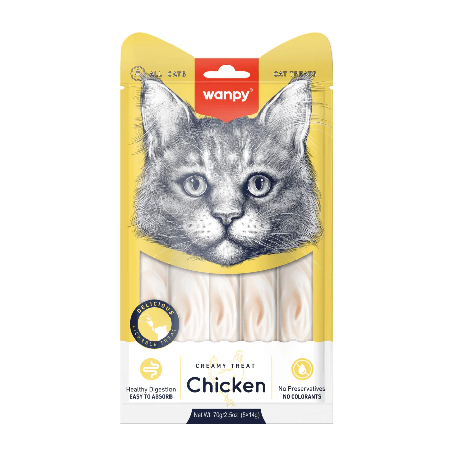 Wanpy Cat Creamy son delicias que a los gatos les gusta lamer. Una delicia pastosa única para las lenguas quisquillosas de los gatos. Puedes ponerlos en un bowl, en un juguete o simplemente en tu dedo. Tienen un sabor irresistible, atraparán a todos los gatos.
